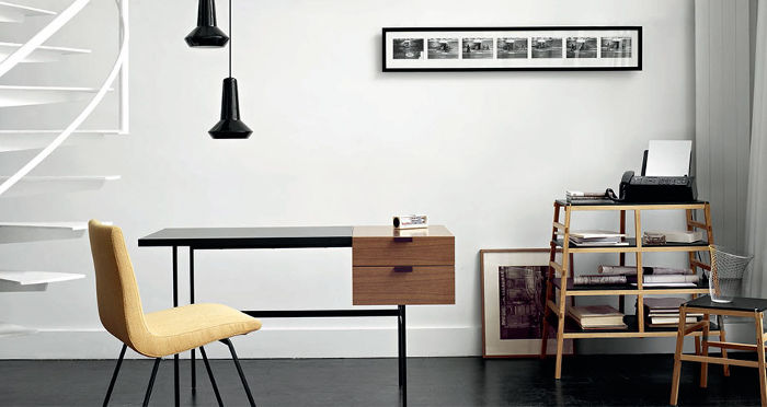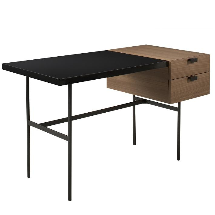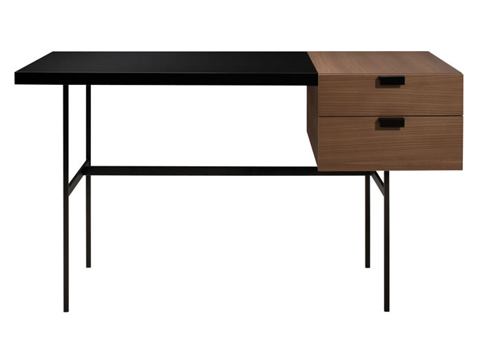 Het blad is geupgradet in krasvrije Fenix laminaat, een rond buizenframe en de ladenblok in notelaar fineer.