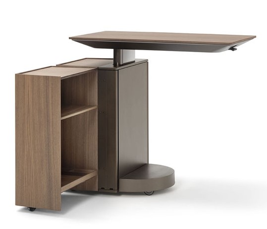 De unit heeft een metalen structuur die bestaat uit een basis met daarop een bedrade centrale staander. De staander ondersteunt op zijn beurt ook de structuur van het werkblad, dat is voorzien van verticale en horizontale positioneringsinrichtingen waarmee de gebruiker de hoogte en positie van het werkblad kan aanpassen, zodat het comfortabel en ergonomisch is voor elk type activiteit. De staander is ook uitgerust met een oplaadbare batterij, evenals stroom- en USB-uitgangen voor het opladen van elektronische apparaten.