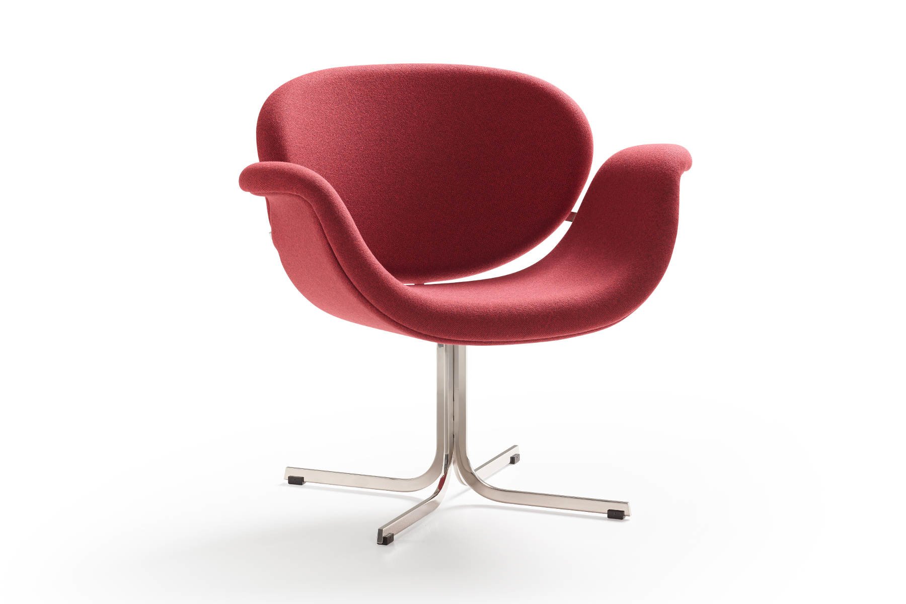 Tulip Midi is vrolijk, sierlijk en uitnodigend tegelijkertijd. De fauteuil is verkrijgbaar met een draaibare schijfvoet of een vaste kruisvoet, in gepolijst RVS of vele lakkleuren.