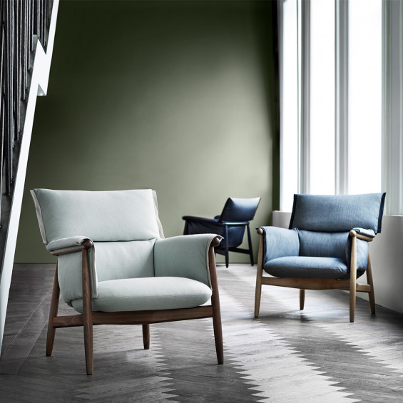 Embrace stoel E005 van Eoos . Verschillende houtversies mogelijk. In stof of leder. Voorgestelde basis prijs in stof en gezeept eiken.