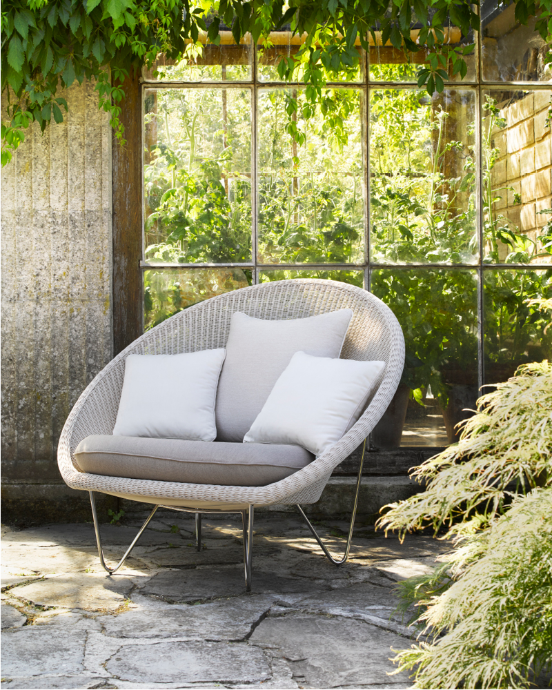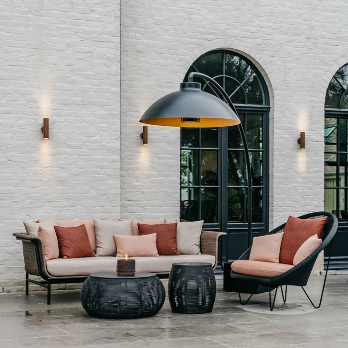 Zwarte outdoor Lounge zetel met set kussens in carbon beige, verschillende kleuren en stoffen naar wens.