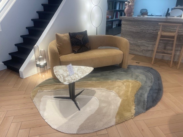 Tapijt keivormig 'Allegro' in blauwgrijs-zachtgeel en ecru tinten.